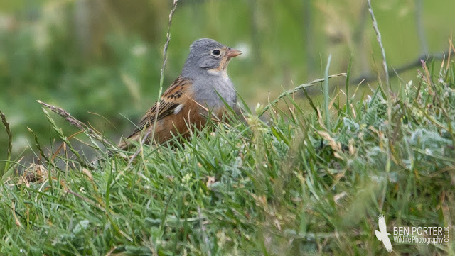 The male CRETZSCHMAR'S BUNTING was re-found midday, when it was heard singing near the South End wall. After a brief search it showed on the dirt track, before flying northward towards Ty Pellaf, and disappearing towards the observatory. About half an hour later, the bird was found feeding in Traeth Ffynnon, where most of the island's birders and visitors managed to connect with this rather stunning bird. At about 1300, the bunting flew over onto bank near Cafn, before disappearing for the rest of the day.