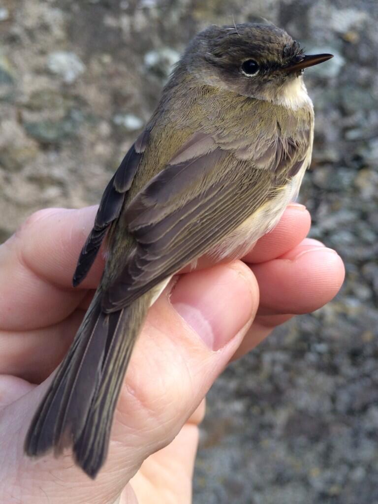 Three Chiffchaffs were trapped and ringed during the day. This bird, like a handful of other birds in recent weeks, possessed a hint of a grey flush to the ear coverts and nape. This might suggest a more eastern origin. This bird also had 'pollen hornes', like many other Chiffchaffs at the moment. (c) Steve Stansfield